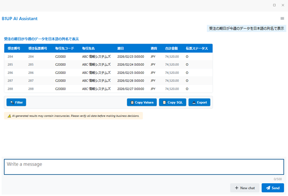 生成するクエリについても、一般的なAIではSAPが公開している項目しか参照できない一方で、B1UP AIならデータベースの項目を直接参照できますので、追加したユーザー定義項目も含めた結果を得ることができます。
