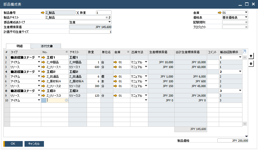 では、実際のSAP Business Oneの部品構成表画面を見てみましょう。
