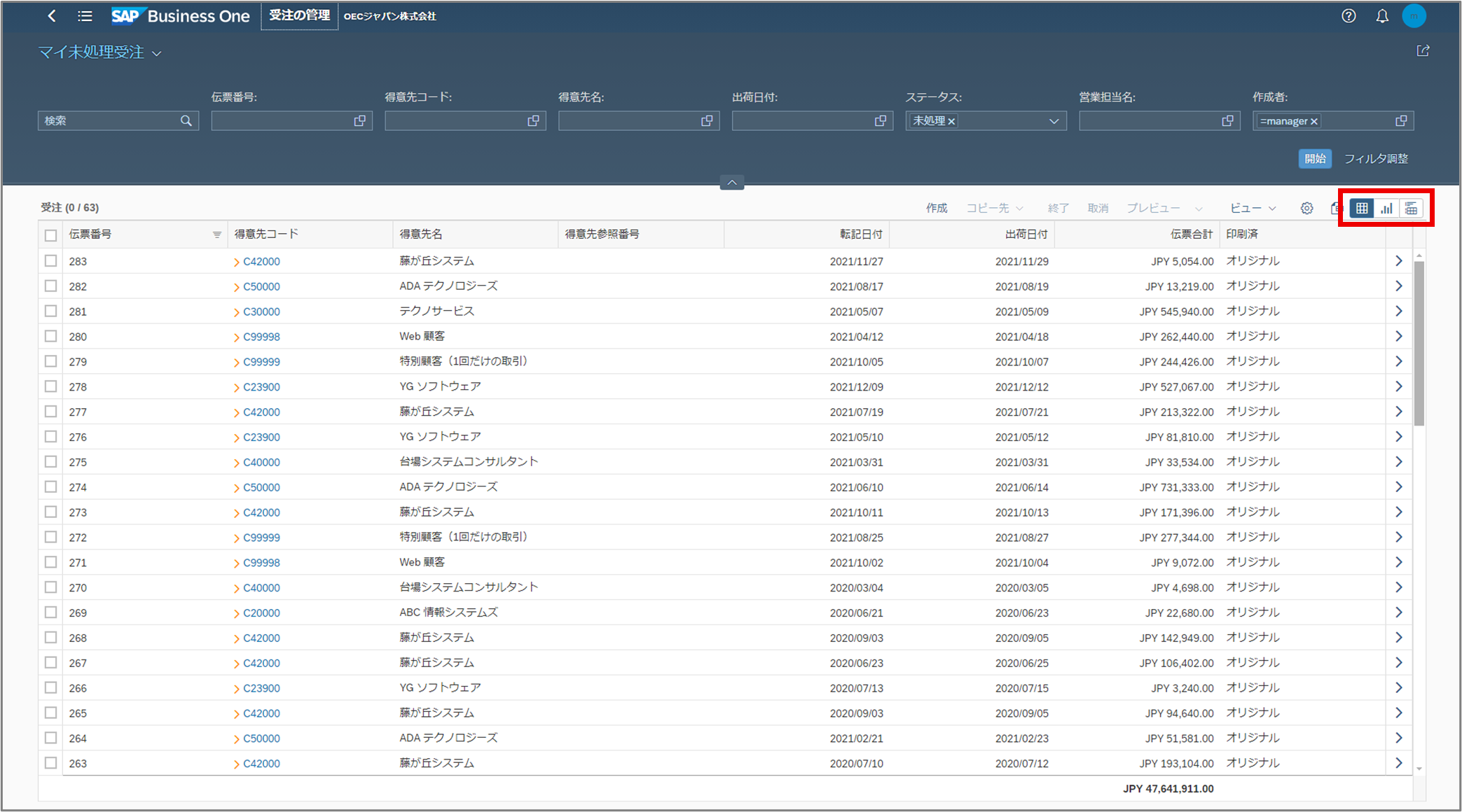 1. 伝票一覧画面に遷移し、画面右上のボタンで見え方を選択