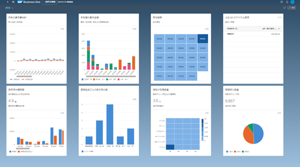 Webクライアントでは、SAPのUXコンセプトである SAP Fiori が採用されており、シンプルで分かりやすい画面構成と、直感的な操作性を実現しています。また、グラフやダッシュボードを活用したデータの可視化や